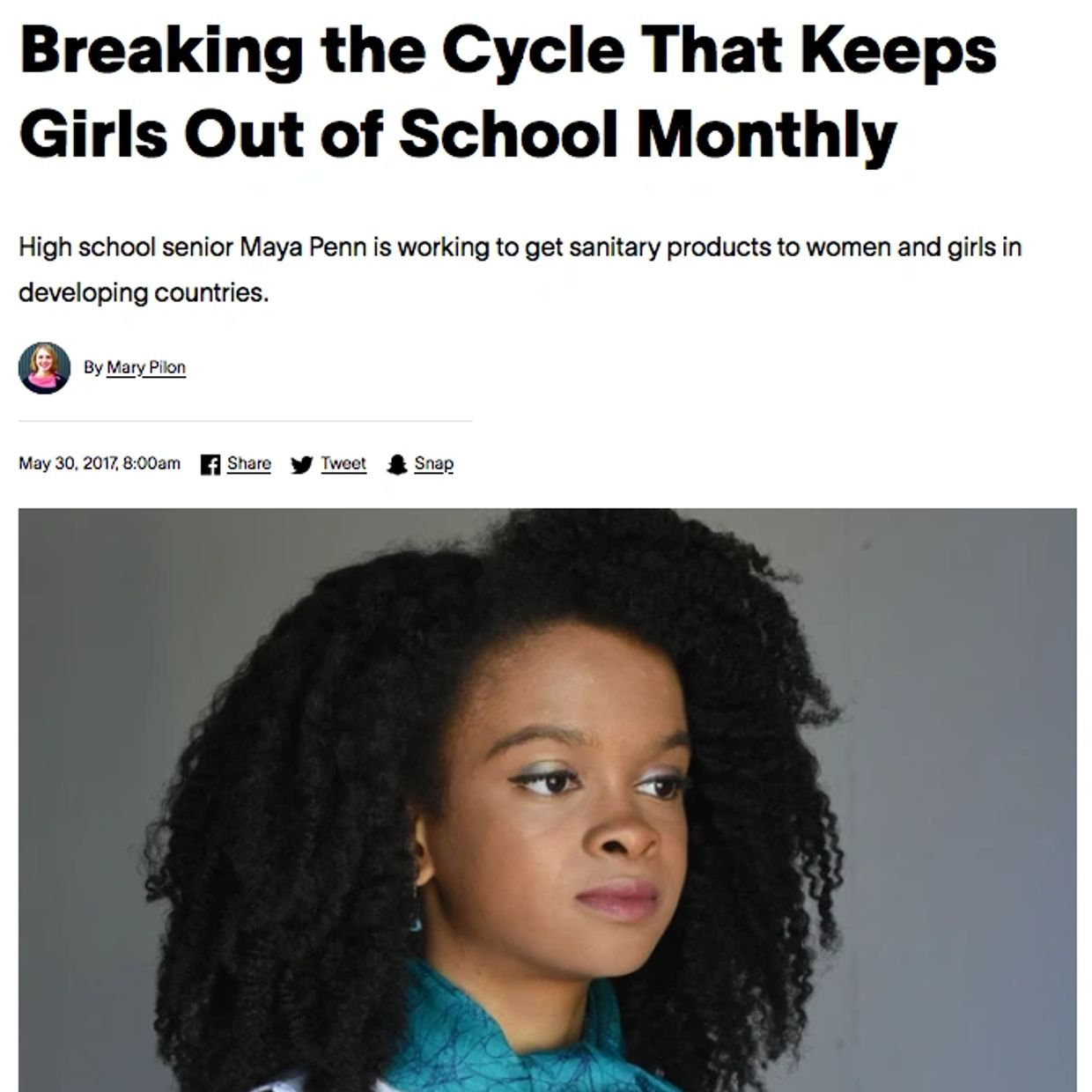 In 2012 Maya launched a project where she designed and created eco-friendly reusable/rewashable sanitary pads for girls in countries in need. Many menstruators that have access to education cannot go to school on their monthly cycle because they have no sanitary pads to wear and taking around 5 days a month out of school can lead to youth dropping out of school. Since the project launch Maya's Ideas 4 The Planet has worked with MedShare and Youth Action Without Borders to distribute 3,000 sanitary pad kits. Since then the kits have been shipped to healthcare facilities in Haiti, Senegal, and Cameroon.